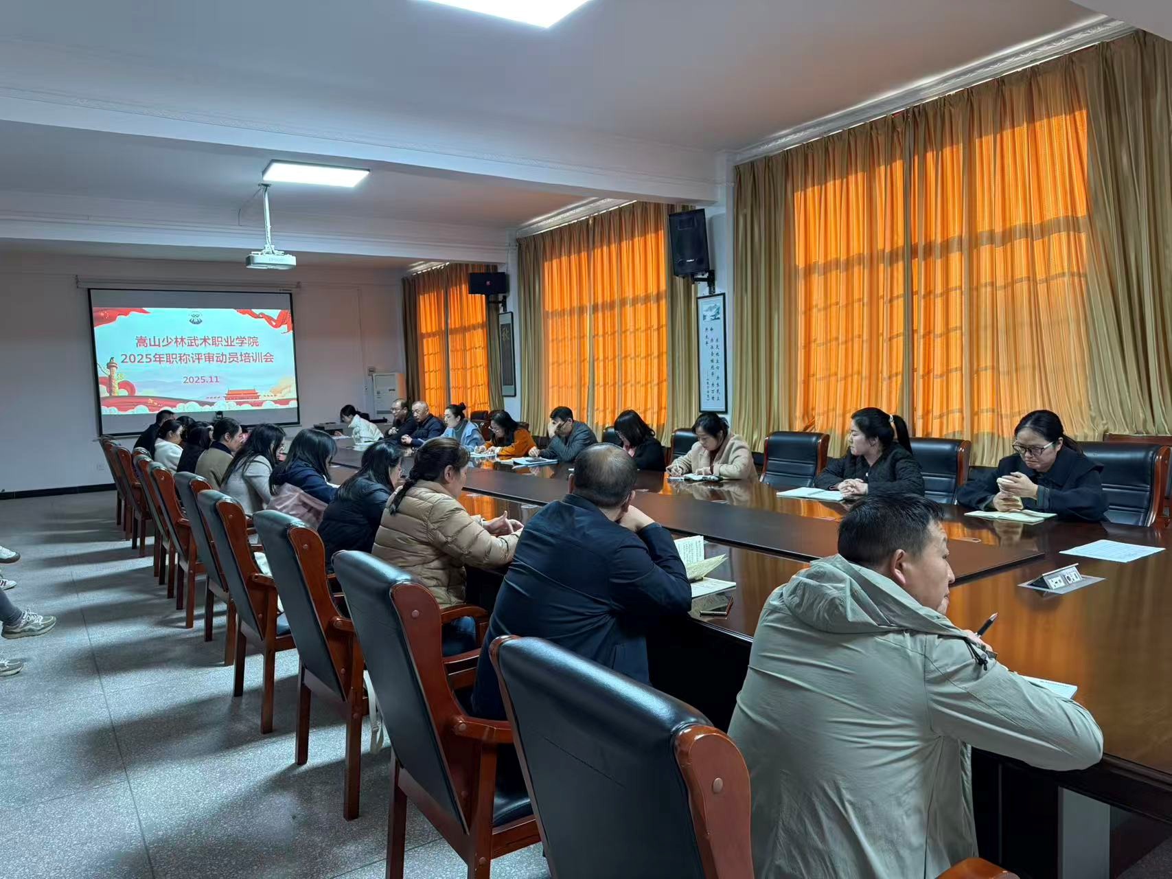 为深入贯彻落实河南省人力资源和社会保障厅职称评审工作部署要求,进一步规范我校2025年度职称评审工作流程,明确申报标准、严明纪律红线,助力申报人员精准把握填报规范,切实保障评审工作公平、公正、公开、高效推进,充分激发全校教师队伍干事创业的内生动力,持续强化高素质师资队伍建设,11月3日下午3:00,嵩山少林武术职业学院在一号政务楼1406会议室隆重召开2025年职称评审动员培训会议。会议由人事部门景静主持,各院系职称评审工作主要负责人、各业务部门负责人及2025年全体职称申报人员齐聚一堂,凝聚思想共识、明确工作方向、细化任务分工,为年度职称评审工作有序开展吹响号角。