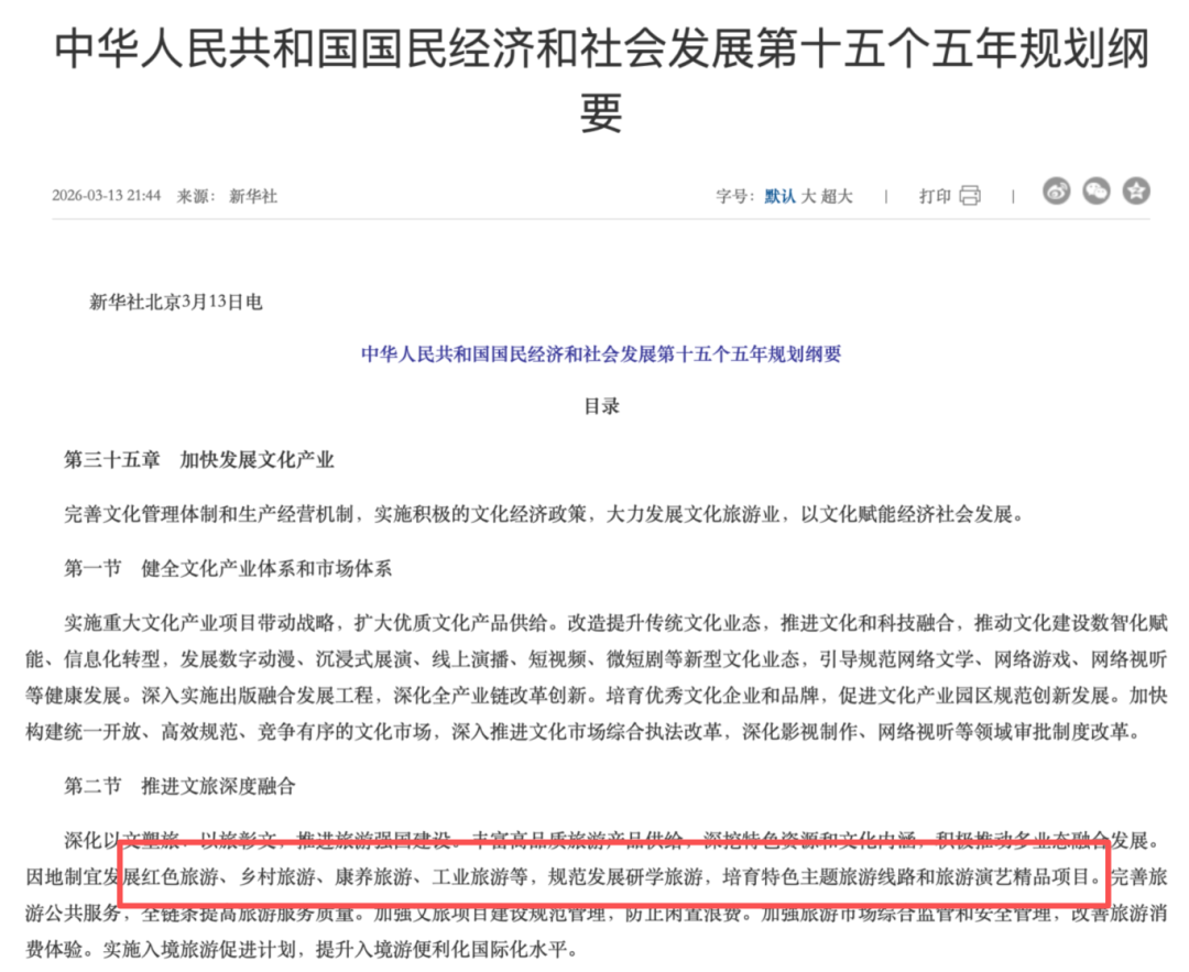 2025年1月,国办文件首次正式提出“创新发展研学旅游”,“研学旅游”开始进入国家层面正式文件。不久前发布的“十五五”规划纲要相关表述中,我们也看到“规范发展研学旅游”的表述。由此可见,“研学旅游” 已成为国家层面官方话语。